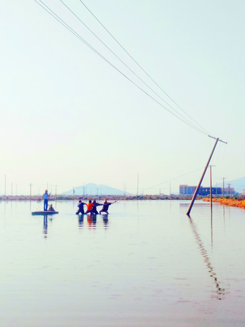 9月20日,該所組織人員進行搶修。搶修人員經過現(xiàn)場勘查后,發(fā)現(xiàn)隱患地點處于池塘中,搶修車輛等大型工器具無法到達,只能靠人工搶修。在與魚塘養(yǎng)殖戶協(xié)商后,俞德春、楊祖加、楊新軍等搶修人員在對低壓線路采取停電、驗電、掛接地等安全措施后,利用小木船來回穿梭、傳送材料,再跳入沒腿深的水里,將電桿扶正、加固。此時,水面上的船、水中的人、拖拽的線路成了鏡頭中的新聞亮點。最后在經過半個多小時的特色搶修后,成功恢復供電。(錢明華)