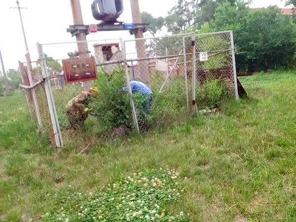 清理外置的變電設(shè)備周圍環(huán)境。通過夏季雨水的滋潤,外置的變電設(shè)備周圍長(zhǎng)滿了鹽蒿、蔓草和蘆葦。有的地方雜草叢生人不能進(jìn)入給維護(hù)造成困難,有的地方蔓草越過圍欄直接爬上電桿威脅線路安全,有的直接被淹沒在蘆葦叢中,不見了蹤影,給變電設(shè)備的環(huán)境帶來惡化和安全隱患。為此,供電所組織人員進(jìn)行全面清理,完成了16處外置的變電設(shè)備清理工作。