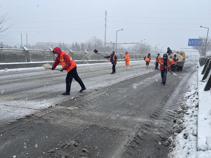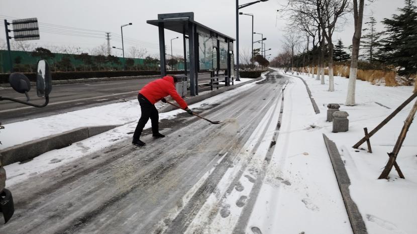 “融雪劑拋灑的時候要均勻拋灑,不要成團堆積,這樣不僅融雪的效果不好,還會浪費物資?!鳖A備黨員武新忠一邊說著,一邊示范著給其他隊員。哪里的積雪最厚,哪里就有他們揮鍬鏟雪的身影。在融雪劑不能及時送達的情況下,他們就使用人工除雪的方式,不斷檔、不離線、不缺位的清除路面積雪,保證路面不出現(xiàn)積雪狀況。為堅決完成上級“雪停路凈”的掃雪除冰任務(wù),他們不畏嚴寒,冒著風雨冰雪,晝夜不停,連續(xù)三天奮戰(zhàn)在掃雪的一線!以雪為令,雪不停,掃雪不止,一直堅守在掃雪工作中,有效清除了區(qū)域內(nèi)的積雪,確保了交通道路的安全暢行。