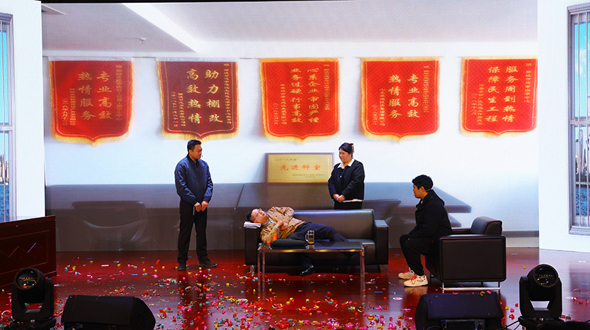 演出在舞蹈《祖國你好》中拉開序幕,隨后,一個個歡快、喜慶、祥和的文藝作品相繼上演。這其中,既有充分展現(xiàn)臺北發(fā)展力量的情景劇《我們是臺北力量》《南泥灣暢想》,也有大氣磅礴的男女對唱《不忘初心》和小合唱《眾人劃槳開大船》,有草原氣息的笛子獨奏《牧民新歌》,諷刺當下“躺平式”干部的廉潔作風小品《坑》,展現(xiàn)公司活力的男團《舞蹈:串燒》《山丹丹花開紅艷艷》,奇特、神秘的魔術(shù)表演,一腔情懷的京劇《沙家浜-唱段軍民魚水情》……最后,在機關(guān)全體人員帶來舞蹈《相親相愛的一家人》中落幕,高潮迭起、精彩不斷,得到廣泛好評。