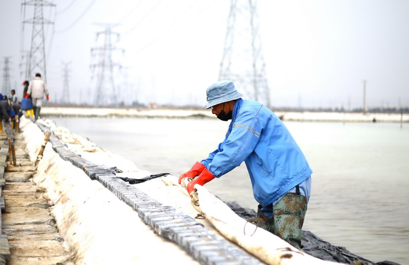 ? ? ? ??首先來到海州灣公司大浦班組。這里是公司礦鹵復(fù)產(chǎn)工作重點班組,職工們正在整理結(jié)晶池、搶修塑苫布。據(jù)海州灣公司負(fù)責(zé)人劉天義現(xiàn)場介紹,由于前期審批、采購等原因,加之突發(fā)的新冠肺炎疫情,結(jié)晶池塑苫布沒能及時更新,預(yù)報25日有明顯降雨過程,海州灣廣大職工因地制宜,收舊利廢,積極備戰(zhàn)大雨天時。