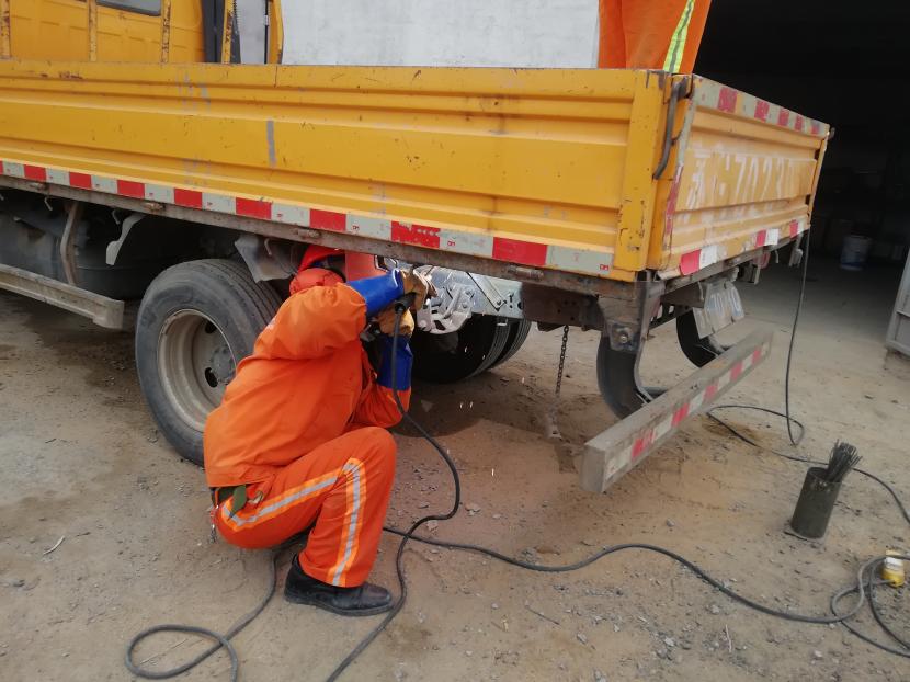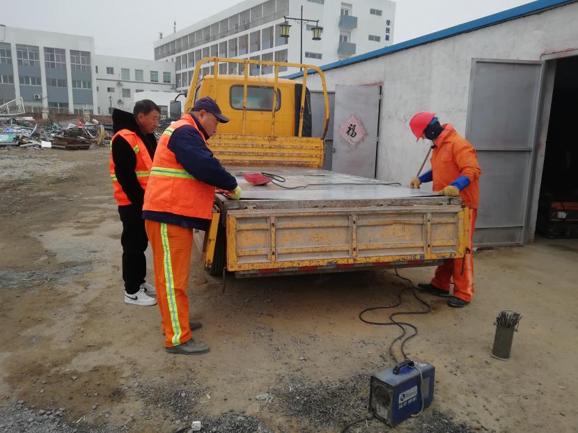 1月9日上午,經(jīng)過(guò)該公司設(shè)備維修班組再三斟酌,考慮如送修理廠維修,不但產(chǎn)生一筆不小的維修費(fèi)用,而且等待維修過(guò)程時(shí)間較長(zhǎng),影響工作進(jìn)度,為能給公司節(jié)省開(kāi)支和不影響工作進(jìn)度,維修人員量好車廂底板尺寸后,將鐵板切割出需要的尺寸,一塊塊拼湊起來(lái),加固在車廂底板上,通過(guò)半天的時(shí)間,順利為工具車底板披上一層合身、漂亮又特別的“盔甲”,有效延續(xù)了它的使用壽命。