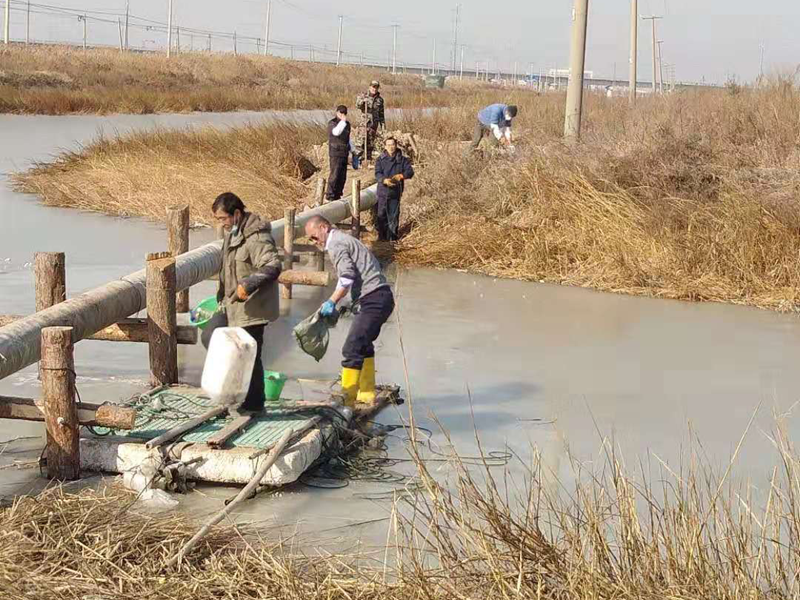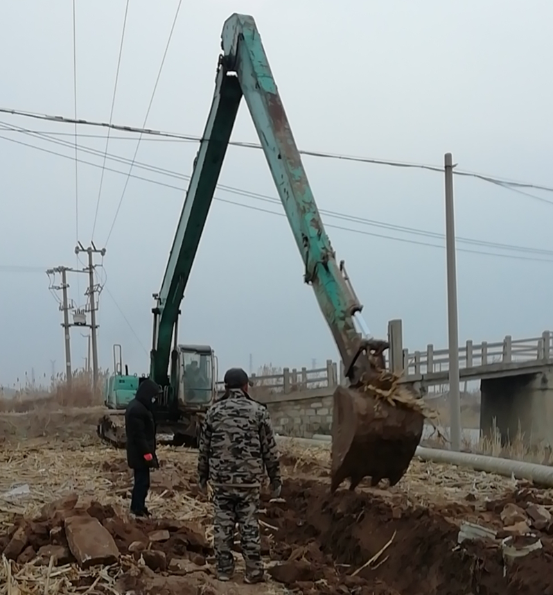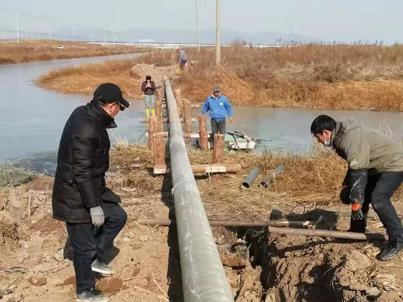 難!難!難!有困難才具有挑戰(zhàn),在“四拼”前一切困難皆為“紙老虎”,大家及時(shí)將壓力變?yōu)閯?dòng)力。確定方案后,立即分頭行動(dòng),一切工作按部就班,購(gòu)買8米木樁,河岸邊專人指揮長(zhǎng)臂挖掘機(jī)機(jī)械打樁,頭頂高壓線與通信線路相互交織,現(xiàn)場(chǎng)安全員全過(guò)程監(jiān)督指揮保障施工安全距離緊張施工,利用簡(jiǎn)易泡沫筏人工敲開河面冰層,劃到河心鉆孔安裝木橫擔(dān),人工開挖河對(duì)岸管道,切割吊取管道,打磨涂覆,一切都在有條不紊的進(jìn)行中??紤]到玻璃鋼管道的易碎性,不敢使用挖掘機(jī)吊裝,只能全人工小心翼翼的一小段一小段的輕抬慢放,慢慢挪到門型橫擔(dān)上緩緩過(guò)河,捆綁固定,最后是對(duì)口纏裹涂覆回填竣工。