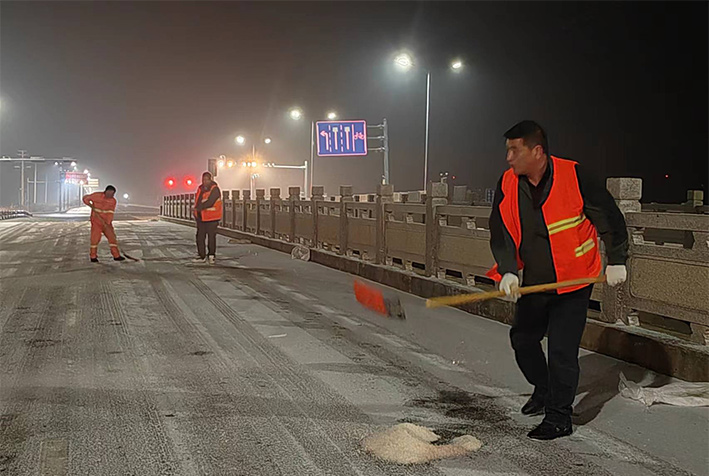 “下雪就是命令!”昨晚幾乎與降雪同步,板橋園區(qū)滿城“橘黃閃耀”。風(fēng)雪中,瑞南人不畏嚴(yán)寒,堅(jiān)守崗位,后勤保障加班加點(diǎn),在連云園區(qū)燒香河大橋上,各班組人員協(xié)同作戰(zhàn),有指揮、有鏟雪、有拋灑融雪劑,他們揮舞鐵鍬、揮動(dòng)掃把,全速進(jìn)行掃雪除冰工作。截止19日凌晨?jī)牲c(diǎn),燒香河大橋、程圩高架橋,上下引坡等交通要道區(qū)域積雪已基本清除完畢,其他路段正在有序清理。     (金知青)