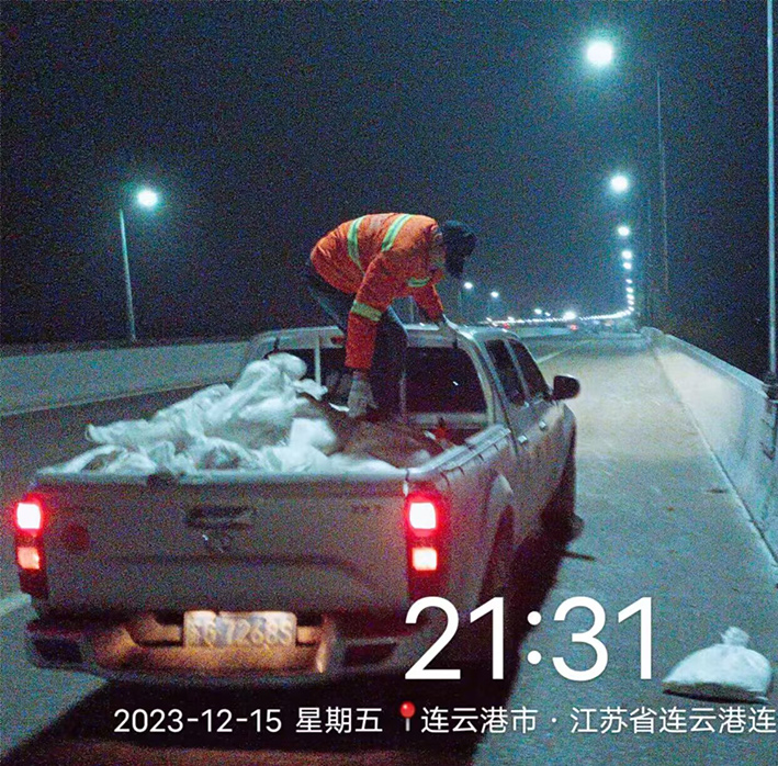 1215日夜間21時左右,受寒潮影響,徐圩大地瞬間飄落鵝毛般雪花。為保障新城主要干道車輛、行人往來石化園區(qū)安全暢通經(jīng)過。保潔分公司結合徐圩城建與悅升公司冬季突發(fā)天氣處置預案,聞雪而動,第一時間啟動布放融雪劑工作,大橋兩側盡顯保潔人無懼嚴寒勞動場景。